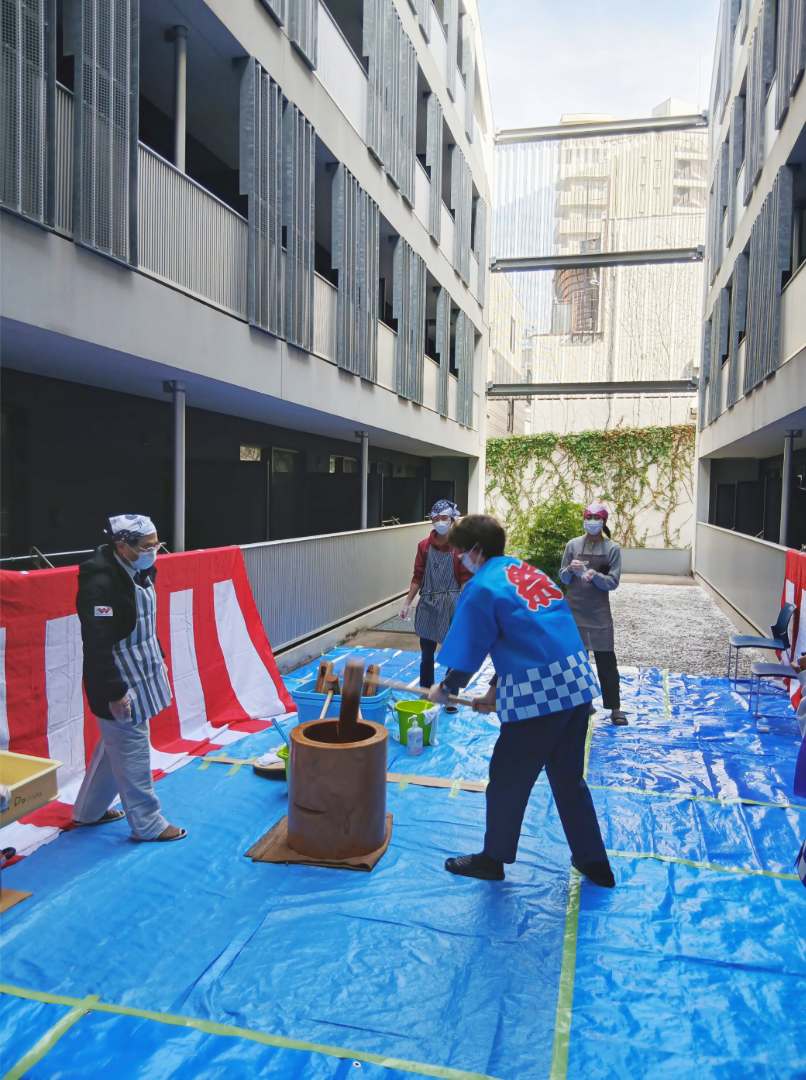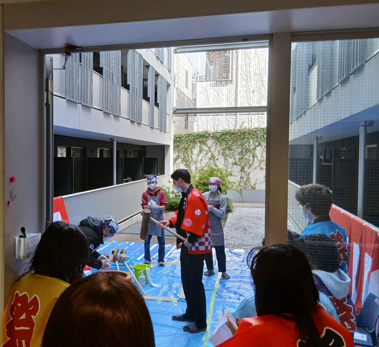 当日は、寮スタッフやRA(レジデント・アシスタント)が中心となり、寮生への餅つき体験の提供および、つきあがった餅の振る舞いを行いました。初めて餅つきを体験する寮生も多く、杵と臼を使った迫力ある餅つきに、会場からは歓声が上がっていました。参加者同士で「よいしょー!」と声を掛け合いながら餅をつくことで、自然と交流が生まれ、国籍や文化の垣根を越えたコミュニケーションの場となりました。